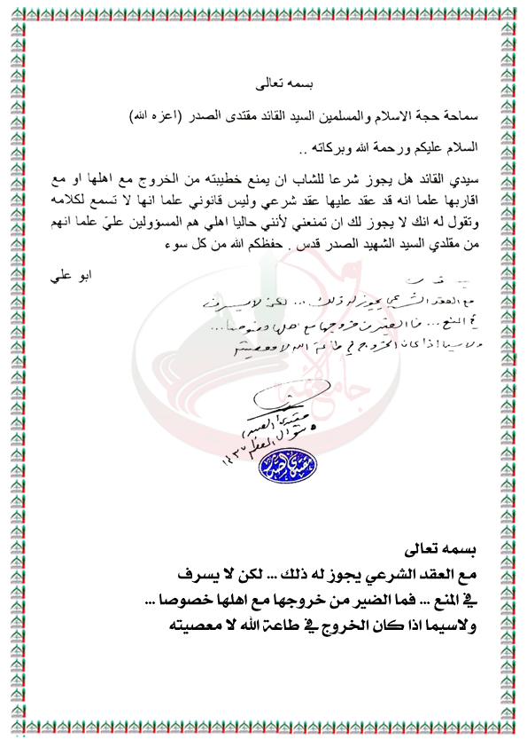 منع الشخص لخطيبته التي عقد عليها شرعا من الخروج مع أهلها استفتاء السيد القائد مقتدى الصدر اعزه الله 14 / 7 / 2016