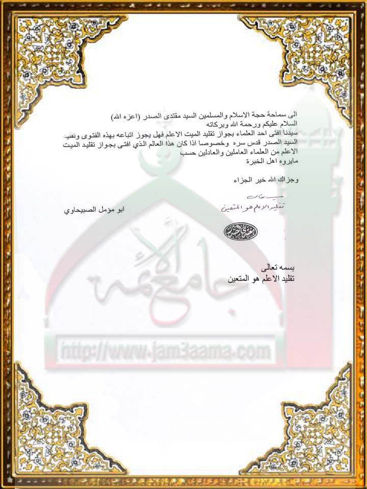 جوازتقليد المجتهد الميت الاعلم استفتاء سماحة السيد القائد مقتدى الصدر ( اعزه الله ) 13-4-2011)