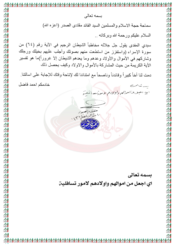 تفسير الآية القرآنية المتعلقة بمشاركة الشيطان للإنسان بالأموال والاولاد استفتاء السيد القائد مقتدى الصدر اعزه الله 17 / 7 / 2016