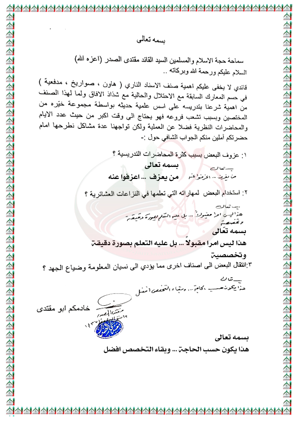 بعض المشاكل التي تواجه معلمي صنف الاسناد الناري في سرايا السلام استفتاء السيد القائد مقتدى الصدر اعزه الله 18 / 7 / 2016