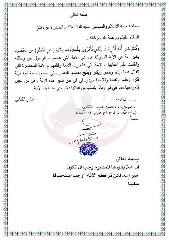 المقصود بالآية الكريمة (كنتم خير أمة اخرجت للناس تأمرون بالمعروف وتنهون عن المنكر) استفتاء السيد القائد مقتدى الصدر اعزه الله 19 / 7 / 2016