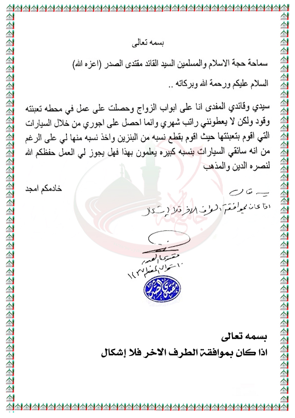 حكم العمل في محطة تعبئة الوقود والحصول على الاجر من خلال استقطاع نسبة من البنزين استفتاء السيد القائد مقتدى الصدر اعزه الله 19 / 7 / 2016