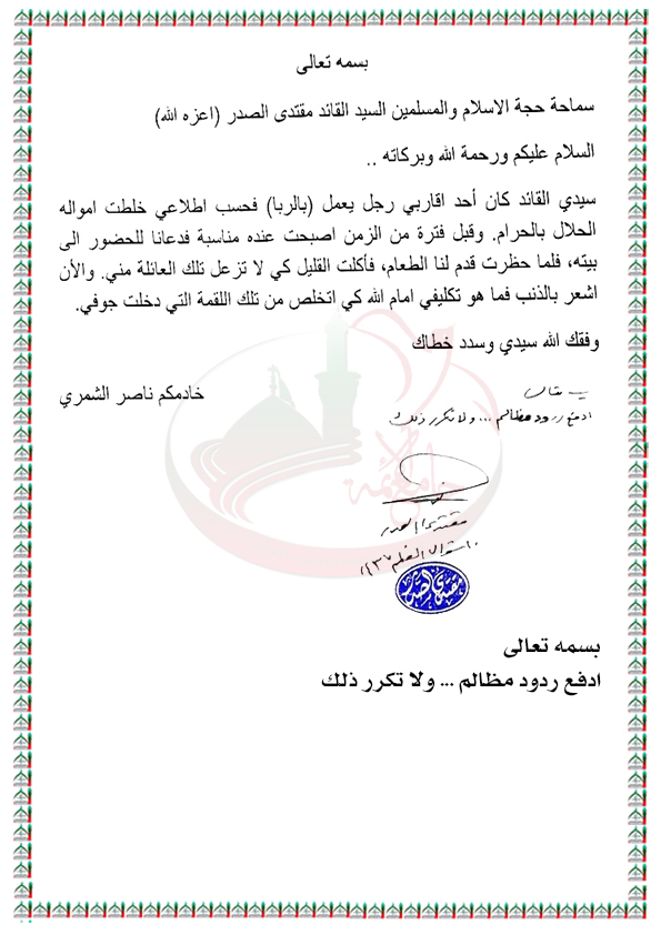 حكم تناول الطعام عند شخص يعمل بالربا استفتاء السيد القائد مقتدى الصدر اعزه الله 19 / 7 / 2016