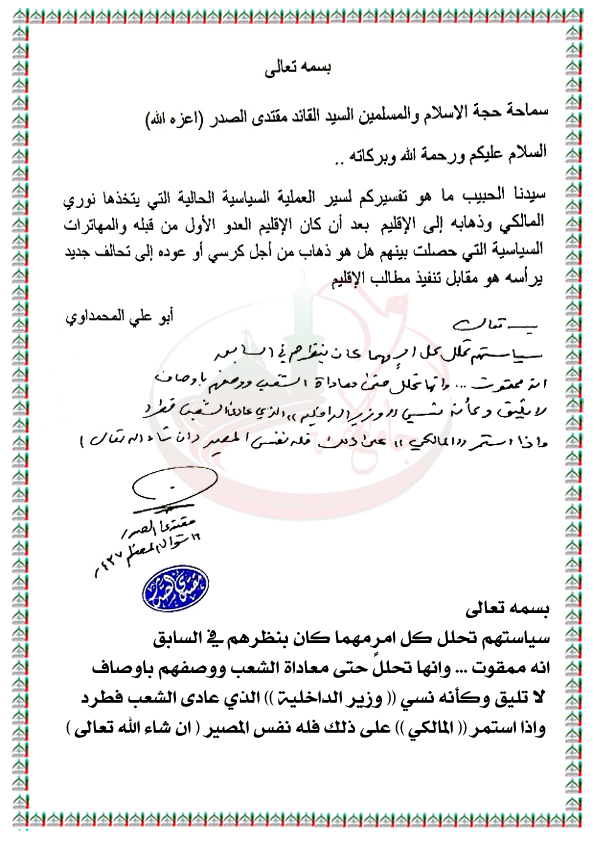 زيارة المالكي للإقليم : سياستهم تحلل كل أمر مهما كان بنظرهم في السابق انه ممقوت استفتاء السيد القائد مقتدى الصدر اعزه الله 21 / 7 / 2016