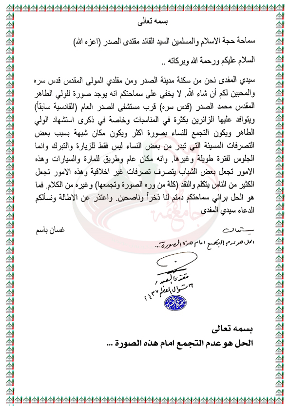 ما ينبغي عمله للقضاء على بعض التصرفات المسيئة من بعض النساء المتجمعات قرب احدى صور السيد الشهيد الصدر(قدس) استفتاء السيد القائد مقتدى الصدر اعزه الله 23 / 7 / 2016
