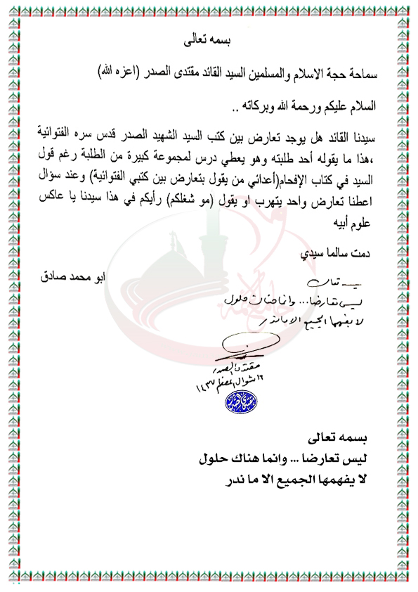 عدم وجود تعارض في الكتب الفتوائية للسيد الشهيد الصدر(قدس) استفتاء السيد القائد مقتدى الصدر اعزه الله 24 / 7 / 2016