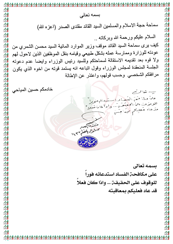 عودة وزير الموارد المائية محسن الشمري للوزارة وممارسة عمله بشكل طبيعي استفتاء السيد القائد مقتدى الصدر اعزه الله 24 / 7 / 2016