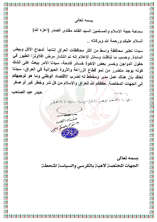 شكوك بوجود عمل مدبر لضرب الاقتصاد الوطني من خلال ابادة الدواجن في محافظة واسط استفتاء السيد القائد مقتدى الصدر اعزه الله 26 / 7 / 2016
