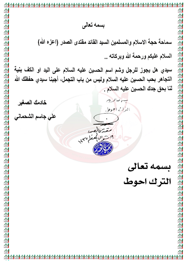 وشم اسم الامام الحسين (عليه السلام) علي اليد او الكف تعبيراً عن التجاهر بحبه استفتاء السيد القائد مقتدى الصدر اعزه الله 26 / 7 / 2016