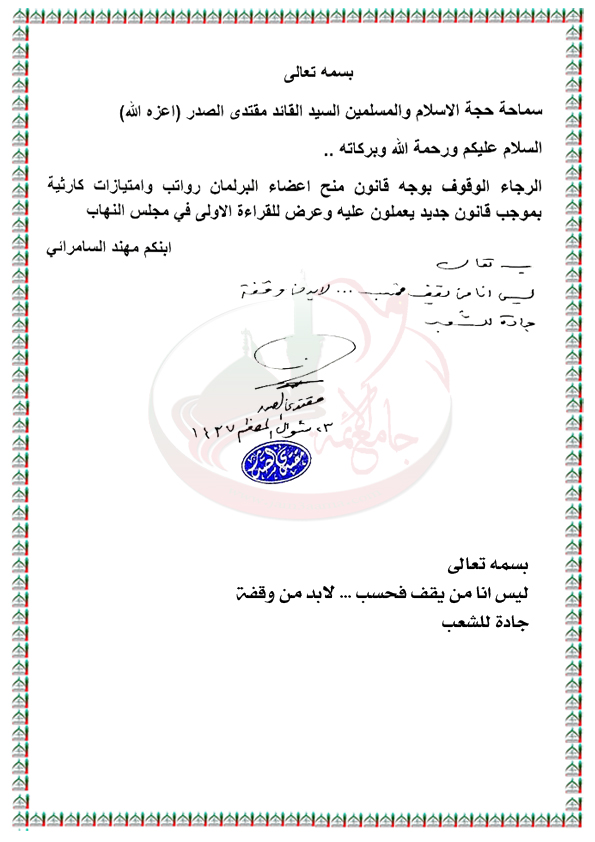 امتيازات اعضاء البرلمان استفتاء السيد القائد مقتدى الصدر اعزه الله 30 / 7 / 2016