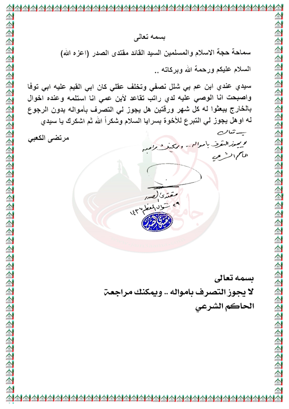 التصرف بأموال شخص معاق ومتخلف عقلياً من قبل ابن عمه الوصي عليه استفتاء السيد القائد مقتدى الصدر اعزه الله 5 / 8 / 2016