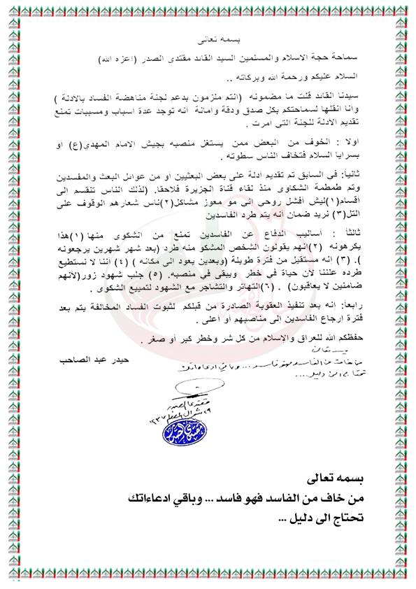 عمل لجنة مكافحة الفساد استفتاء السيد القائد مقتدى الصدر اعزه الله 5 / 8 / 2016