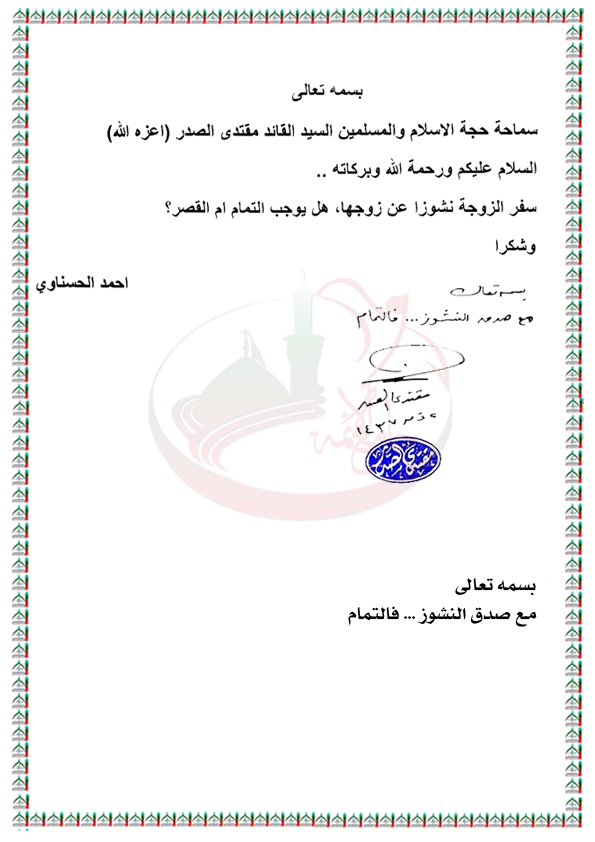 حكم صلاة الزوجة في حال سفرها نشوزاً عن زوجها استفتاء السيد القائد مقتدى الصدر اعزه الله 7 / 8 / 2016