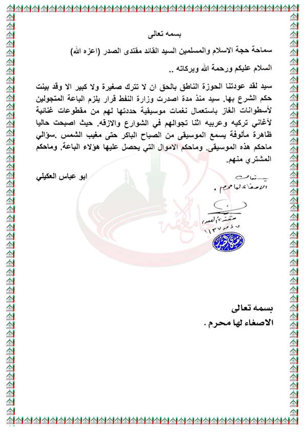 استعمال نغمات موسيقية من قبل الباعة المتجولين لأسطوانات الغاز استفتاء السيد القائد مقتدى الصدر اعزه الله 12 / 8 / 2016