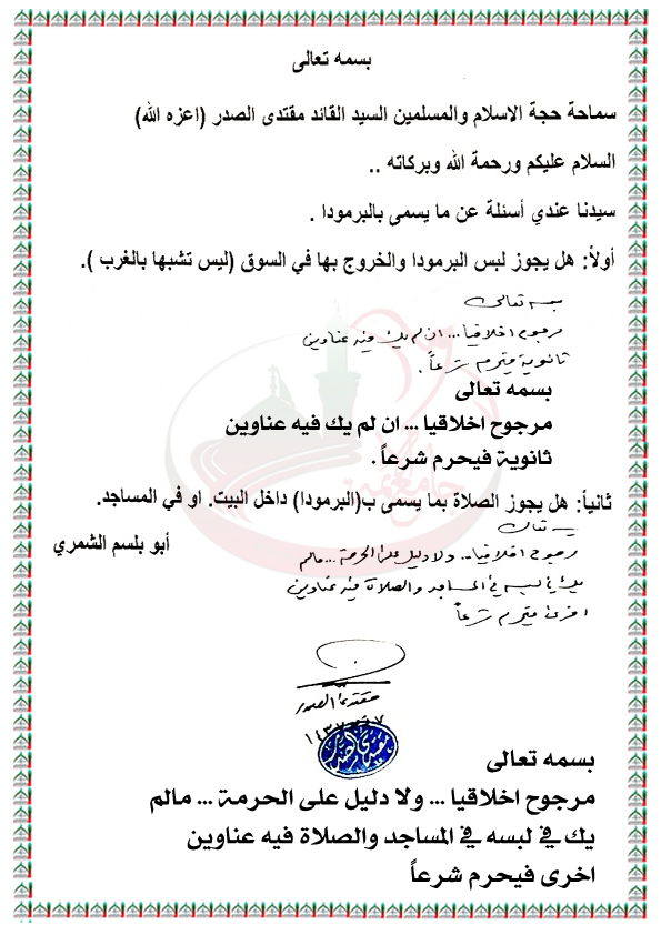 لبس ما يسمى (برمودا) استفتاء السيد القائد مقتدى الصدر اعزه الله 13 / 8 / 2016