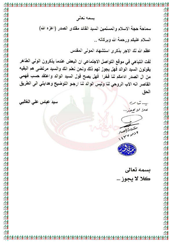 عدم جواز اطلاق كلمة الوالد على السيد الشهيد محمد الصدر( رض ) من غير ابنائه استفتاء السيد القائد مقتدى الصدر اعزه الله 14 / 8 / 2016