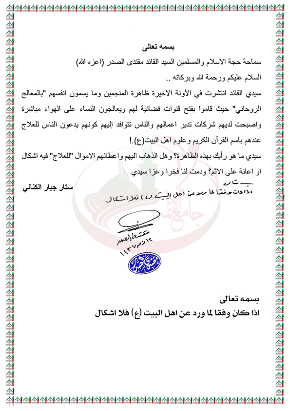 المعالج الروحاني والعلاج بطب اهل البيت عليهم السلام استفتاء السيد القائد مقتدى الصدر اعزه الله 17 / 8 / 2016