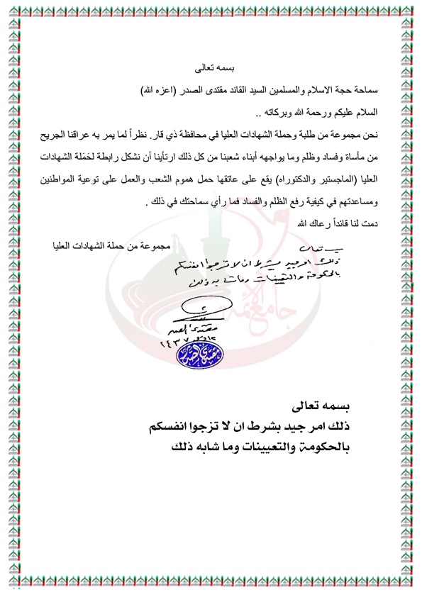 تشكيل رابطة لحملة الشهادات العليا يقع على عاتقهم توعية الشعب وحمل همومه ومساعدته في رفع الظلم والفساد استفتاء السيد القائد مقتدى الصدر اعزه الله 19 / 8 / 2016