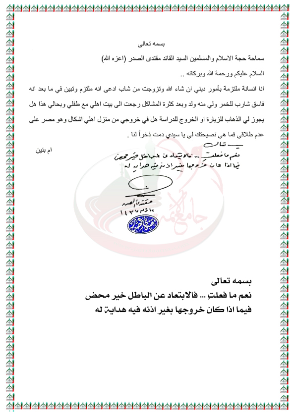 ابتعاد الزوجة عن زوجها الفاسق والشارب للخمر وخروجها من دون اذنه استفتاء السيد القائد مقتدى الصدر اعزه الله 20 / 8 / 2016