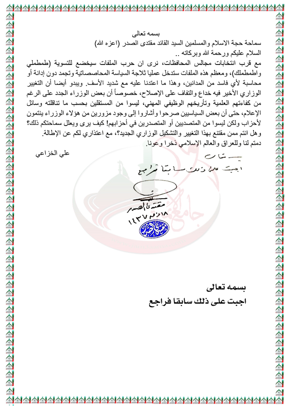 اخفاء وتجميد ملفات الفساد مع قرب انتخابات مجالس المحافظات القادمة وانتماء بعض الوزراء الجدد لأحزاب سياسية استفتاء السيد القائد مقتدى الصدر اعزه الله 24 / 8 / 2016