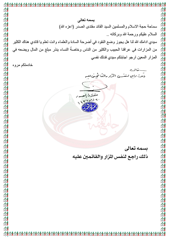 وضع النقود في اضرحة السادة والعلماء استفتاء السيد القائد مقتدى الصدر اعزه الله 25 / 8 / 2016