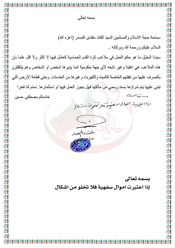 حكم العمل في ملاعب كرة القدم الخماسية استفتاء السيد القائد مقتدى الصدر اعزه الله 26 - 8 - 2016