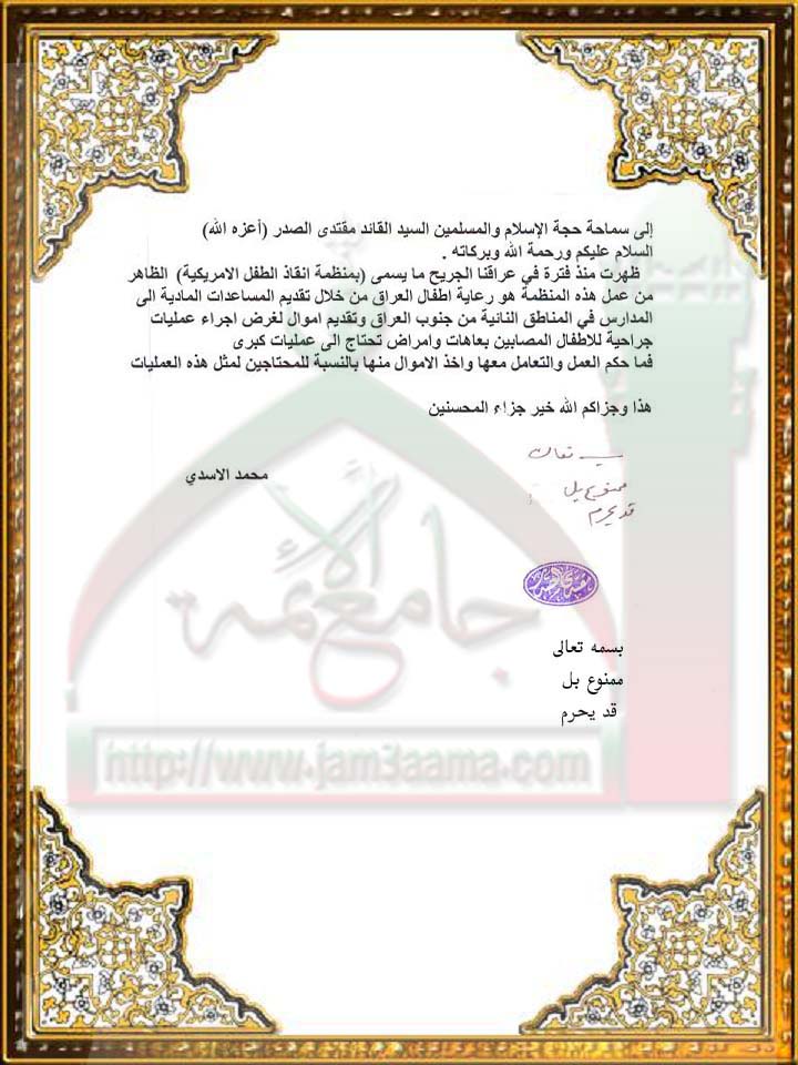 منع وحرمة العمل مع منظمة امريكية استفتاء سماحة السيد القائد مقتدى الصدر ( اعزه الله ) 16-4-2011