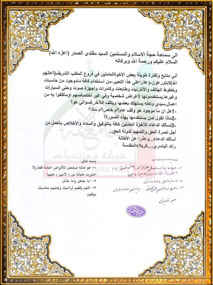 استخدام الاجهزة الموجودة في مكتب السيد الشهيد(استفتاء للسيد القائد بتاريخ 16-4-2011)
