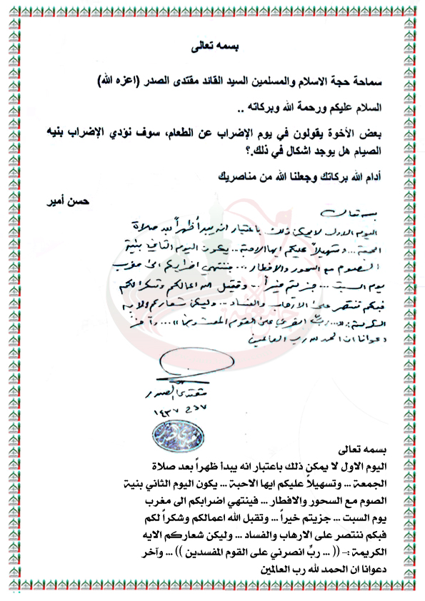 تسهيلاً عليكم ايها الاحبة يكون اليوم الثاني بنية الصوم مع السحور والافطار فينتهي اضرابكم الى مغرب يوم السبت ... استفتاء السيد القائد مقتدى الصدر اعزه الله 9 / 9 / 2016