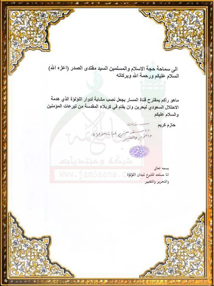 مستعد للتبرع لميدان اللؤلؤة والتحرير والتغيير في كربلاء(استفتاء للسيد القائد بتاريخ 16-4-2011)