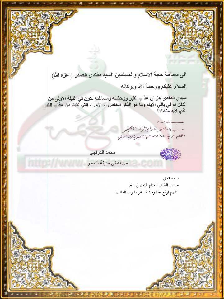 انعدام الزمن في القبر استفتاء سماحة السيد القائد مقتدى الصدر ( اعزه الله ) 16-4-2011
