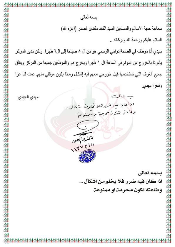 حكم انصراف الموظفين من دوائرهم قبل نهاية الدوام الرسمي بأمر المدير استفتاء السيد القائد مقتدى الصدر اعزه الله 16 / 9 / 2016