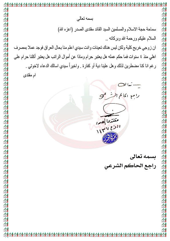 حكم الاضطرار للعمل في المصارف الاهلية استفتاء السيد القائد مقتدى الصدر اعزه الله 19 / 9 / 2016