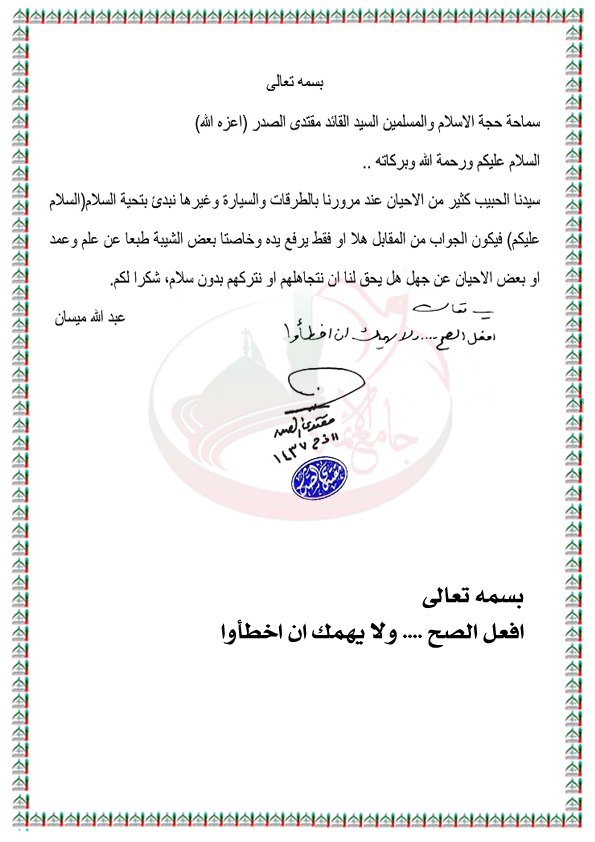 كيفية التعامل مع الذين يردون السلام بطريقة غير مناسبة استفتاء السيد القائد مقتدى الصدر اعزه الله 21 / 9 / 2016