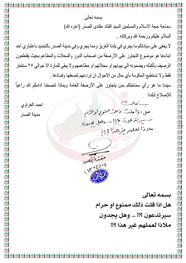 تجاوز بعض اصحاب البيوت والمحلات على الارصفة استفتاء السيد القائد مقتدى الصدر اعزه الله 22 / 9 / 2016