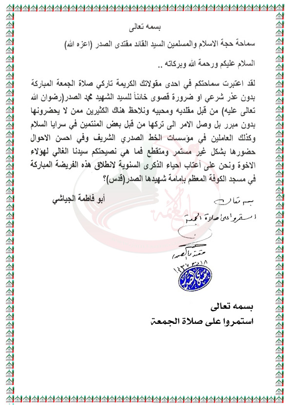 نصيحة سماحته لتاركي صلاة الجمعة ونحن على اعتاب الذكرى السنوية لاقامتها استفتاء السيد القائد مقتدى الصدر اعزه الله 22 / 9 / 2016