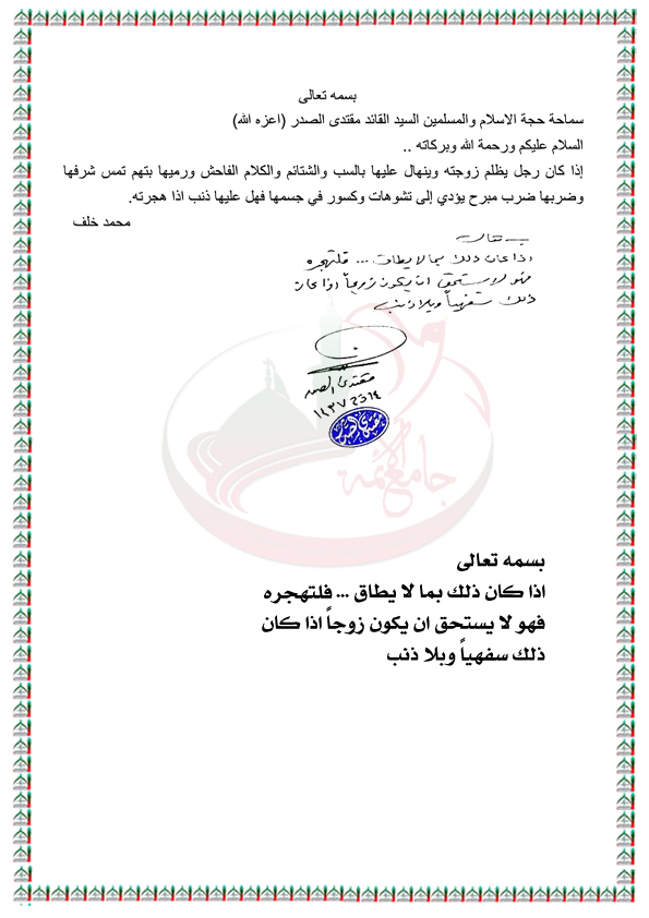 رجل يظلم زوجته وينهال عليها بالسب والشتم استفتاء السيد القائد مقتدى الصدر اعزه الله 23 / 9 / 2016