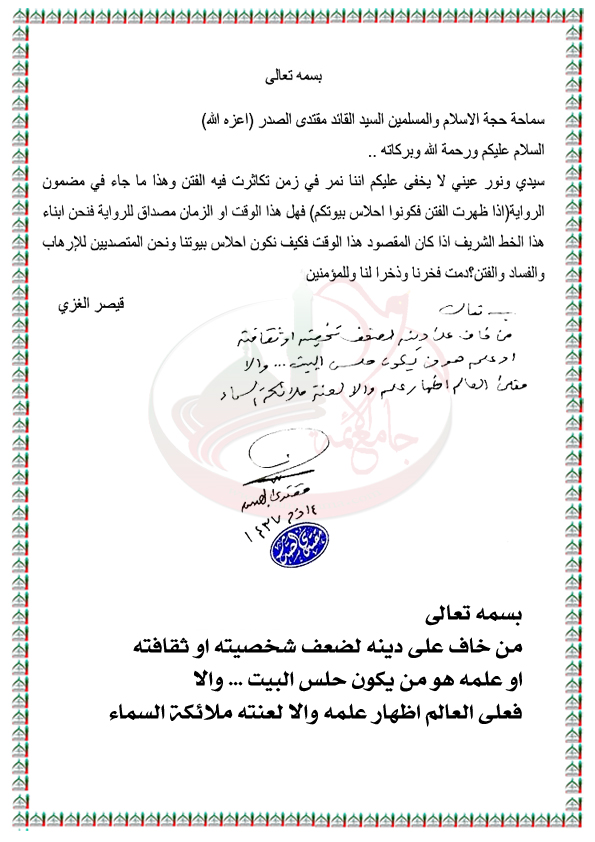الرواية القائلة "إذا ظهرت الفتن فكونوا أحلاس بيوتكم" ومدى ارتباطها بالوضع الحالي للبلد استفتاء السيد القائد مقتدى الصدر اعزه الله 24 / 9 / 2016