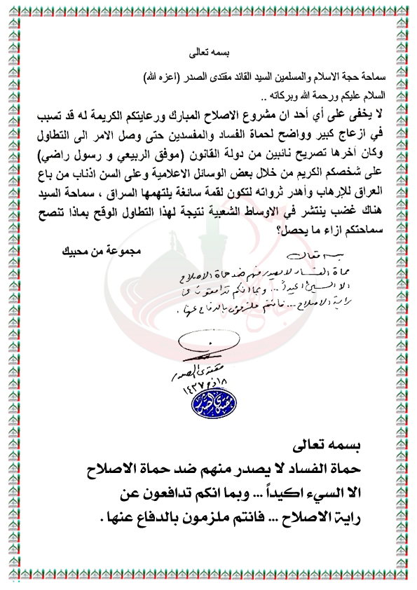 تطاول حماة الفساد على سماحته وعلى مشروع الاصلاح الذي يرعاه استفتاء السيد القائد مقتدى الصدر اعزه الله 25 / 9 / 2016