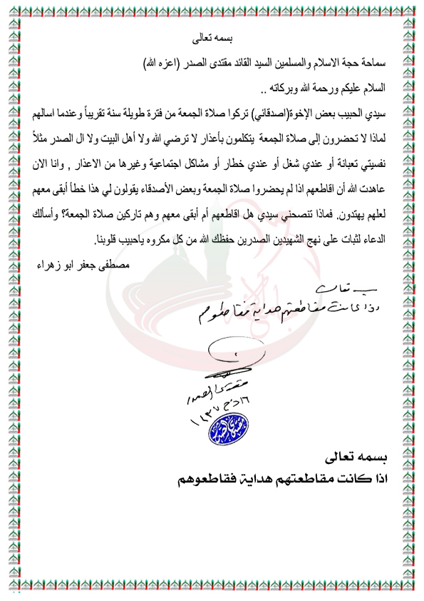 مقاطعة تاركي صلاة الجمعة المباركة استفتاء السيد القائد مقتدى الصدر اعزه الله 27 / 9 / 2016