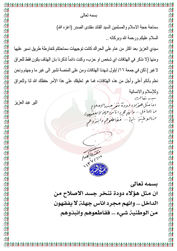 مخالفة البعض من خلال اطلاقهم لهتافات بعيدة عن مشروع الاصلاح الذي يرعاه سماحته استفتاء السيد القائد مقتدى الصدر اعزه الله 28 / 9 / 2016