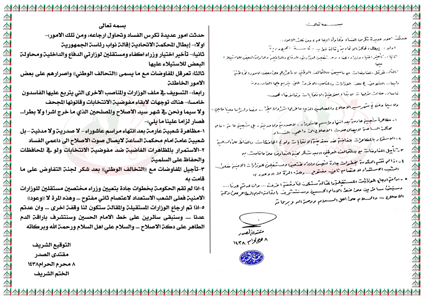 امور حدثت تكرس الفساد ونتشرف باراقة الدم الطاهر على دكة الاصلاح بيان السيد القائد مقتدى الصدر اعزه الله 10 / 10 / 2016