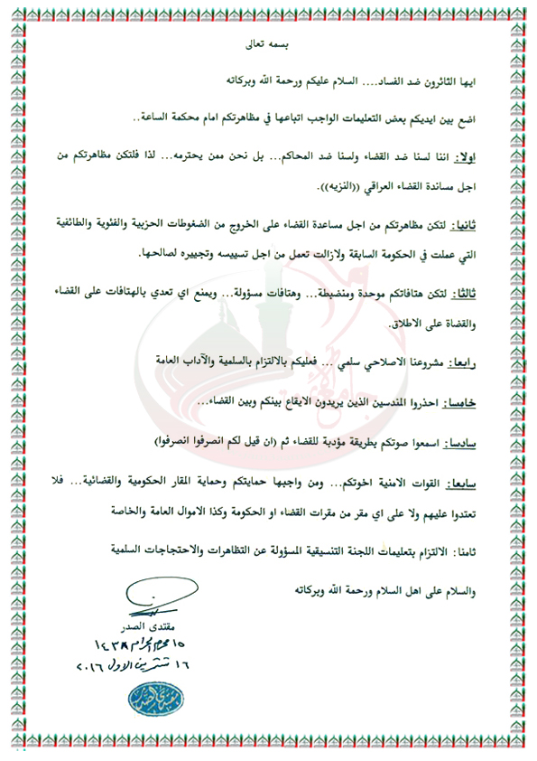 التعليمات الواجب اتباعها في مظاهرة محكمة الساعة بيان السيد القائد مقتدى الصدر اعزه الله 16 / 10 / 2016