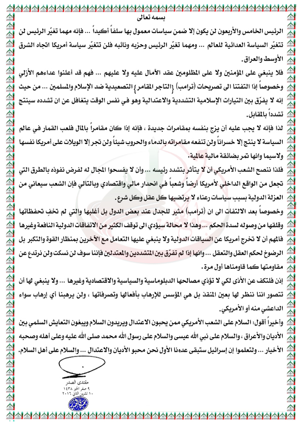 بمناسبة فوز ترامب بالرئاسة الاميركية بيان السيد القائد مقتدى الصدر اعزه الله 10 / 11 / 2016