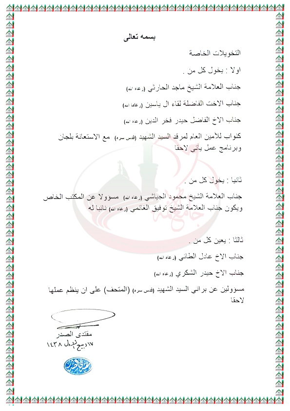 اصدار تخويلات خاصة بيان السيد القائد مقتدى الصدر اعزه الله 17 / 12 / 2016