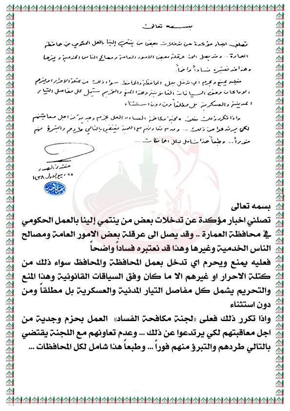 يمنع التدخل بعمل محافظ ميسان سواء من كتلة الأحرار أو غيرهم إلا ما كان وفق السياقات القانونية بيان القائد السيد مقتدى الصدر اعزه الله 25 / 12 / 2016