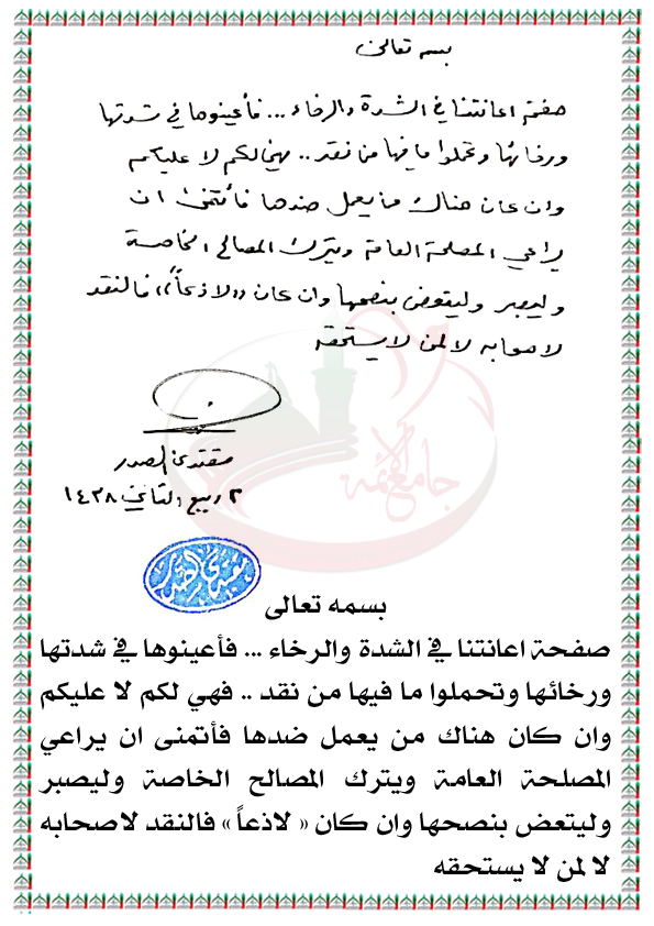 صفحة صالح محمد العراقي أعينوها في شدتها ورخائها وتحملوا ما فيها من نقد فهي لكم لا عليكم بيان القائد السيد مقتدى الصدر اعزه الله 2 / 1 / 2017