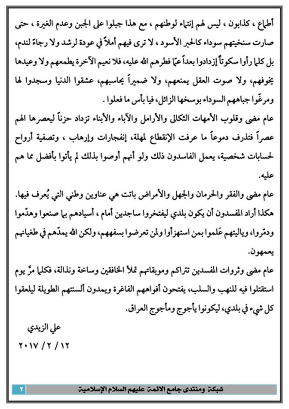 عام مضى على التظاهر والإعتصام ، سمته البارزة أنّه سلمي ولا يزال ينادي ( سلمية، سلمية، سلمية ) ليثبت هذا الشعب للعالم بأنّه شعب يعشق الإنسانية مهما حاول الحاقدون والطامعون من ضياع هذا المعنى في عراقنا المظلوم . عام مضى والطالبون بالإصلاح كل يوم يمر وهم يزدادون همّة وتمسكاًً بمطلبهم ، عزيمتهم لا تفتر وصبرهم يشتد وطاعتهم تزداد وشعورهم بالمسؤولية الملقاة عليهم يُحثهم على المضي في هذا الطريق بالرغم من أنّه قد يطول . عام مضى ودماؤنا سالت بنهر الشهادة ، وجراحنا تزداد شدة برصاص الفاسدين الذين استأسدوا أمام سلميتنا وتفانينا لهذه السلمية ، ولأنهم يعلمون بل يوقنون بهذه السلمية تمادوا وتمادوا وتمادوا ، بالرغم من أنهم لم يرموا بظرف رصاصة على من تجرأ وأحتل أرض العراق ومياهه شمالاًً وجنوباًً وشرقاًً وغرباًً . عام مضى والوطن يستصرخ الغيارى من الرجال لينقذوه من هذا المد المتطفل ، جهلاء ذوي أطماع ، كذابون ، ليس لهم إنتماء لوطنهم ، مع هذا جبلوا على الجبن وعدم الغيرة ، حتى صارت سنخيتهم سوداء كالحبر الأسود ، لا ترى فيهم أملاًً في عودة لرشد ولا رجاءً لندم، بل كلما رأوا سكوتاًً إزدادوا بعداً عمّا فطرهم الله عليه، فلا نعيم الآخرة يطمعهم ولا وعيدها يخوفهم، ولا صوت العقل يمنعهم، ولا ضميراً يحاسبهم، عشقوا الدنيا وسجدوا لها ومرغّوا جباههم السوداء بوسخها الزائل، فيا بأس ما فعلوا . عام مضى وقلوب الأمهات الثكالى والأرامل والآباء والأبناء تزداد حزناً ليعصرها الهم عصراً فتذرف دموعاً ما عرفت الإنقطاع لمهلة، إنفجارات وإرهاب ، وتصفية أرواح لحسابات شخصية، يعمل الفاسدون ذلك ولو أنهم أوصوا بذلك لم يأتوا بأفضل مما هم عليه. عام مضى والفقر والحرمان والجهل والأمراض باتت هي عناوين وطني التي يُعرف فيها. هكذا أراد المفسدون أن يكون بلدي ليفتخروا ساجدين أمام ، أسيادهم بما صنعوا وهدّموا ودمّروا، وياليتهم عَلموا بمن استهزأوا ولمن تعرضوا بسفههم، ولكن الله يمدّهم في طغيانهم يعمهون. عام مضى وثروات المفسدين تتراكم وموبقاتهم تملأ الخافقين وساخة ونذالة، فكلما مرَّ يوم استقتلوا فيه للنهب والسلب، يفتحون أفواههم الفاغرة ويمدون ألسنتهم الطويلة ليلعقوا كل شيء في بلدي، ليكونوا يأجوج ومأجوج العراق. علي الزيدي |