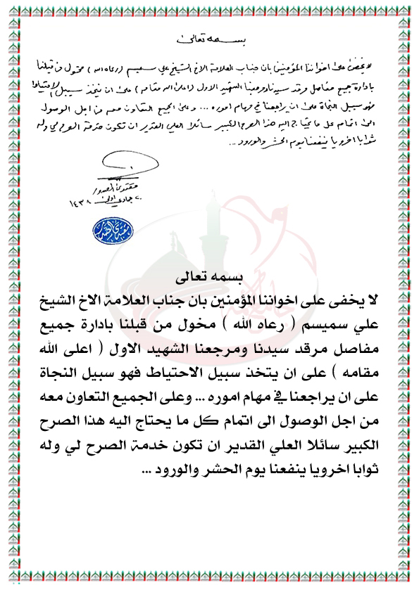 على الجميع التعاون مع جناب الشيخ علي سميسم كونه مخولاً بإدارة جميع مفاصل مرقد السيد الشهيد الصدر الأول ( قدس ) بيان القائد السيد مقتدى الصدر اعزه الله 20 / 2 / 2017