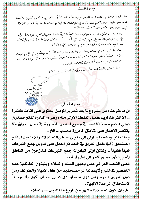 الدعوة للمبادرة بفتح صندوق دولي لدعم حملة الاعمار في جميع المناطق المتضررة في داخل العراق وعدم الاقتصار على المناطق المحررة بيان الزعيم العراقي السيد مقتدى الصدر اعزه الله 14 / 3 / 2017